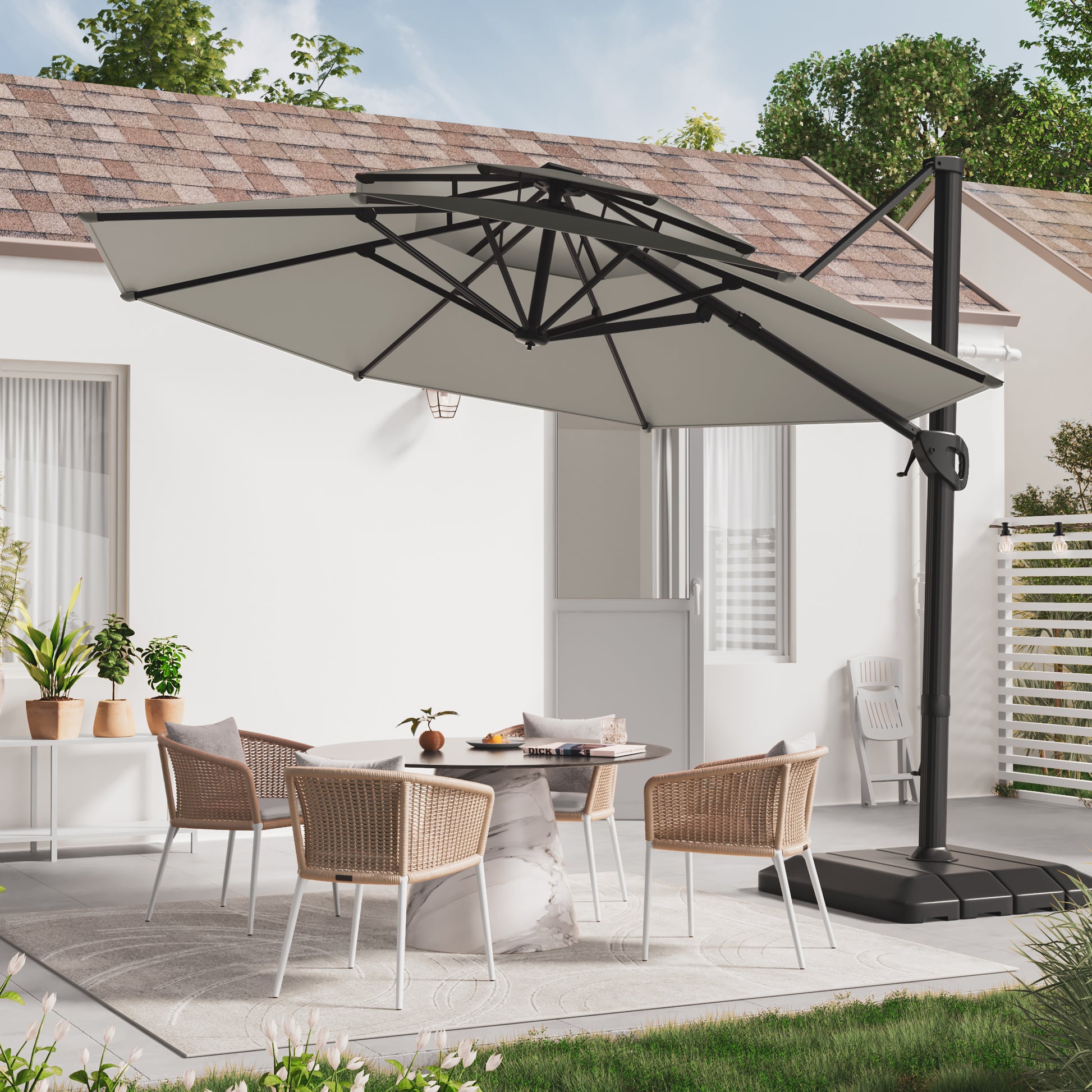 - 360¡ã Rotation: This cantilever umbrella allows 0-360¡ã horizontal rotation via a crank, easily operated from your lounge chair, saving time and energy for more cool, relaxing moments.