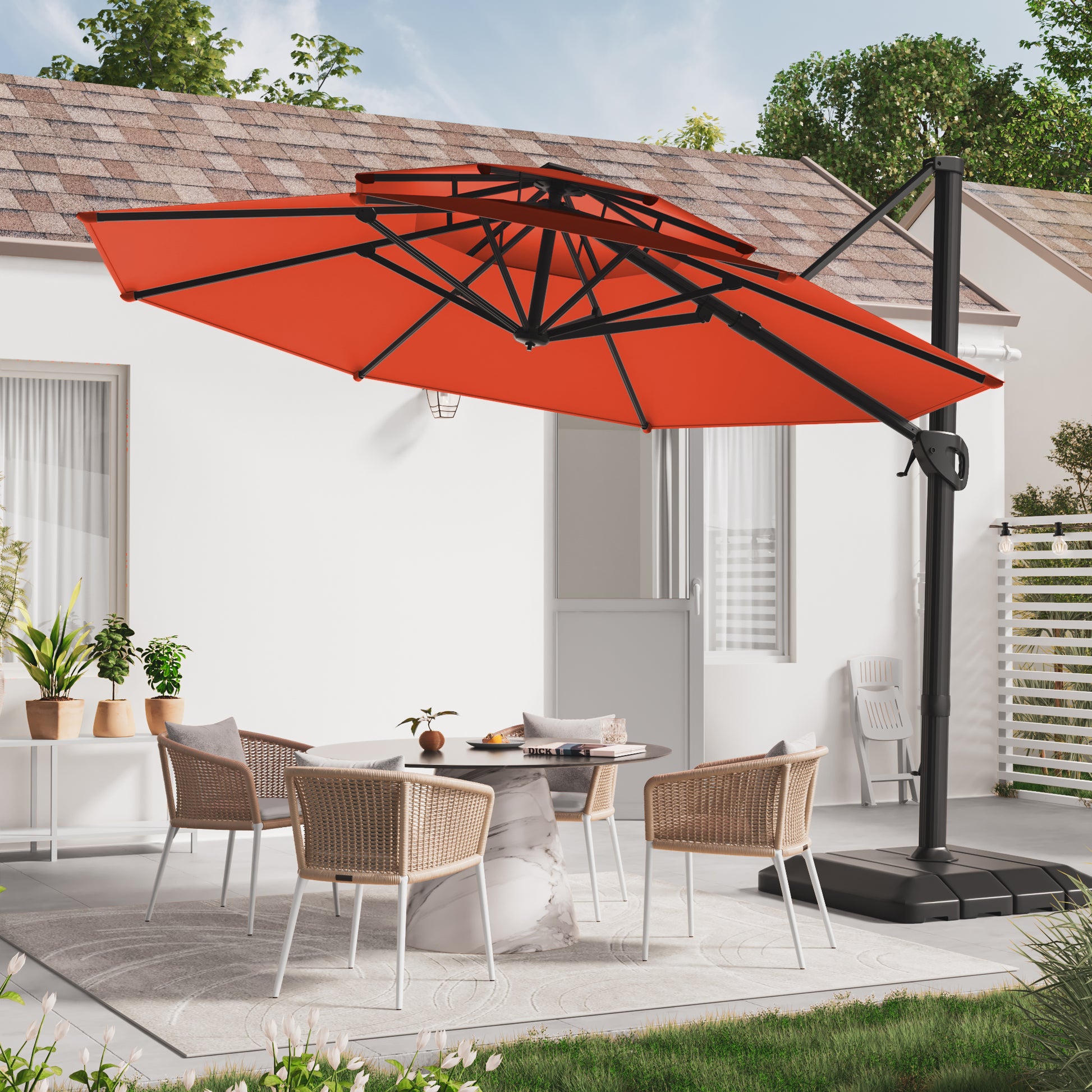 Cantilever umbrellas provide superior shade with 360-degree rotation to follow the sun's path, ensuring all-day comfort. The rust-resistant aluminum frame withstands harsh weather, featuring reinforced joints and a strengthened crank mechanism for durable support and smooth adjustments.