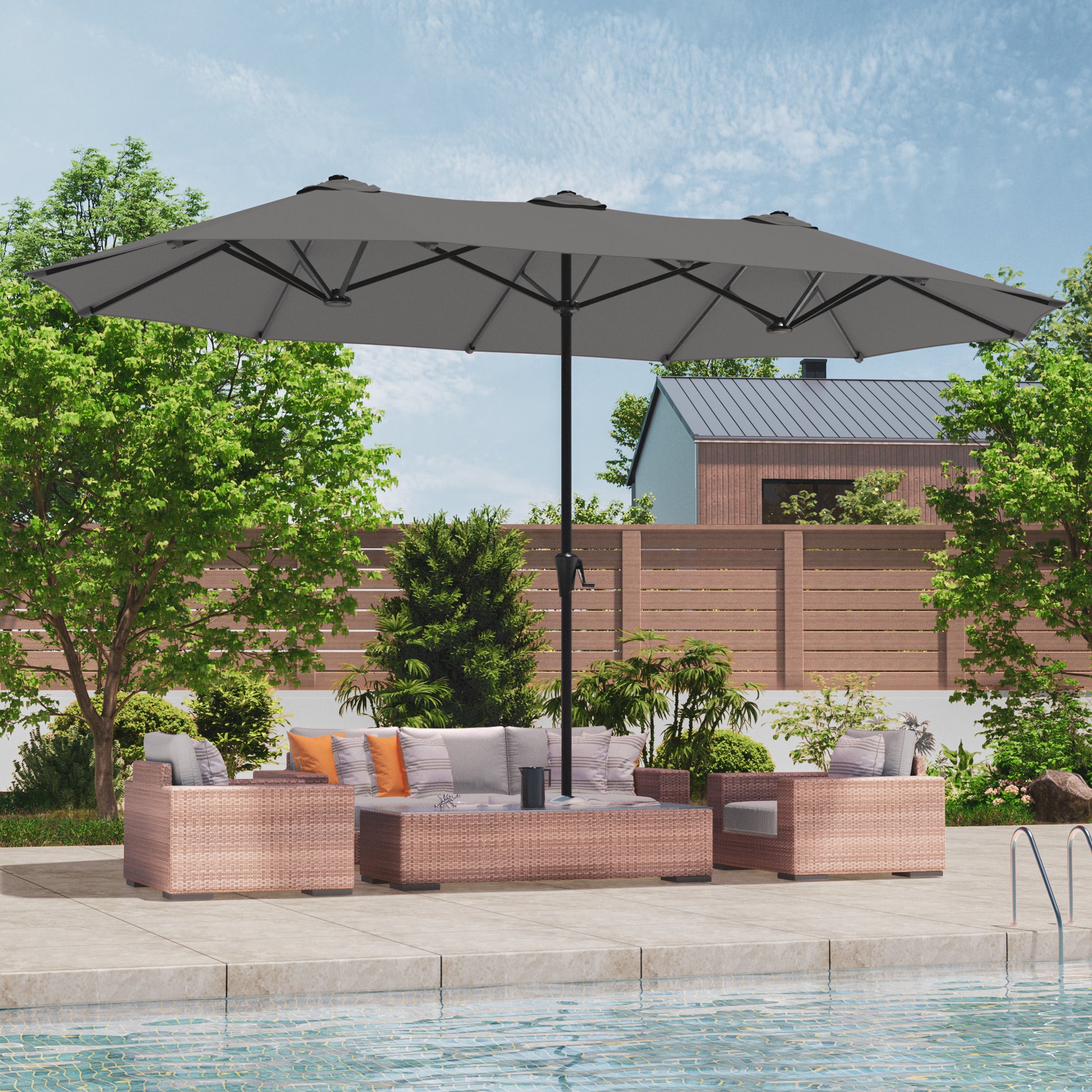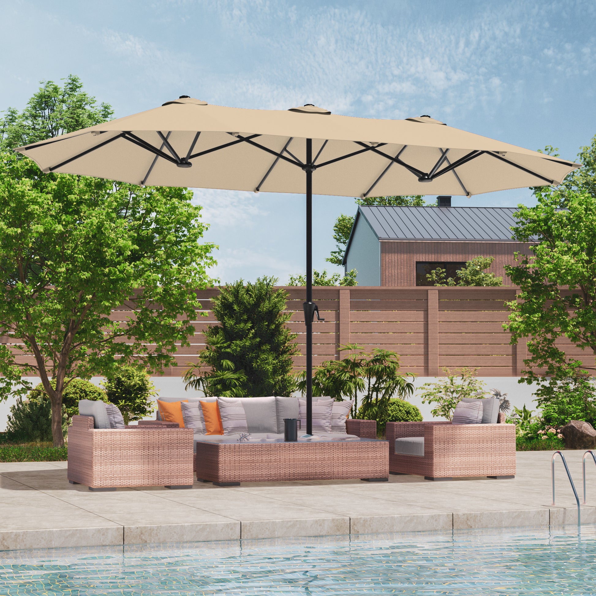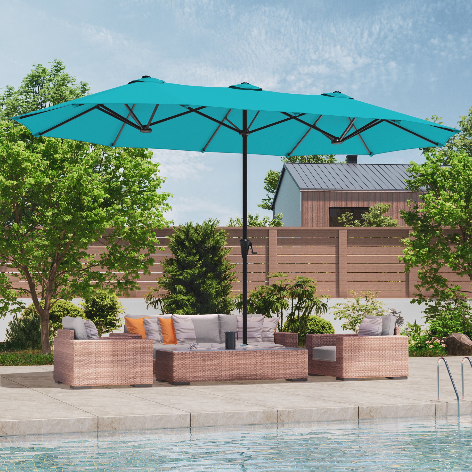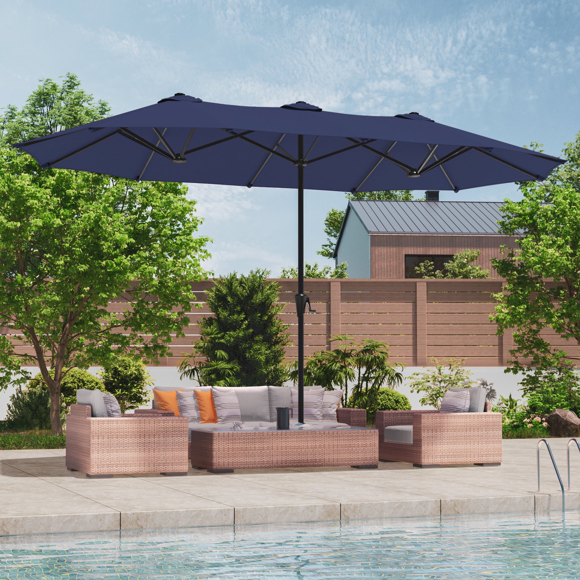 Unleash Outdoor Freedom - Experience outdoor freedom with our double-sided patio umbrella, a revolution in shade technology. Featuring a double-sided design, offering expansive shade coverage. Effortlessly control your shade with the easy-glide crank system, allowing you to open and close easily.